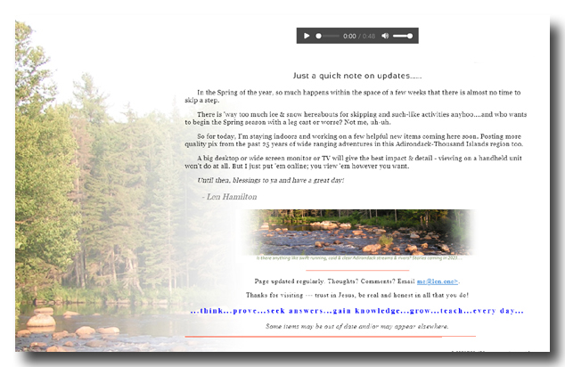 Okay, so I missed the chance to add an expanded visual arts section again; but maybe, in the season ahead....? My autobiographical website is still available while in the shop being reformatted in a newer style. Here's a link to my original Christian ministry site, GospelWord.org. And here's a link to Evans Mills Church, where I minister and am pleased to serve as primary caretaker.